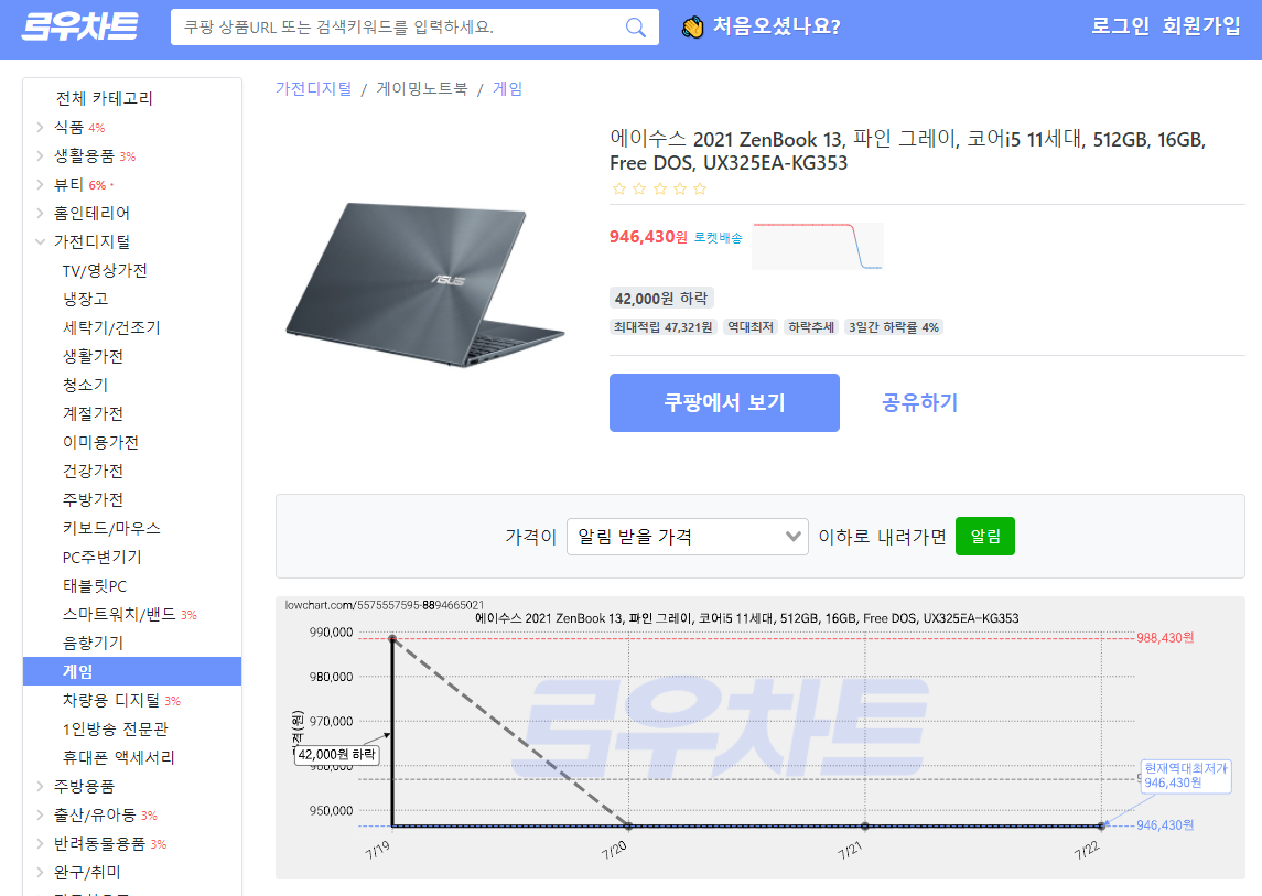 쿠팡 가격변동을 실시간으로 추적하는 웹사이트나 어플도 많이 나와있었다. 하나씩 들어가서 문제의 아수스 노트북을 검색해보았는데 쿠팡에서 크롤링이 잘 안되게 방어를 하는지 추적하는 코드 구현이 제대로 되지 않은 것인지 가격 변동을 정확하게 추적하지 못하거나 제품 검색이 안되는 경우도 많았다.