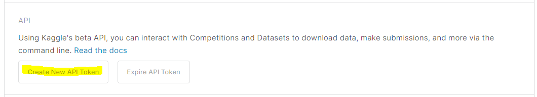 캐글 프로필을 눌러서 Account 탭에 들어간 후 스크롤을 아래로 조금 내리면 Create New API Token 버튼이 있음