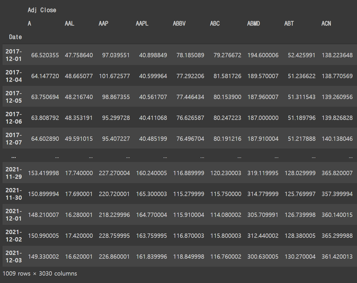 prices = pd.read_parquet('sp500_prices_20171201_20211203.parquet')