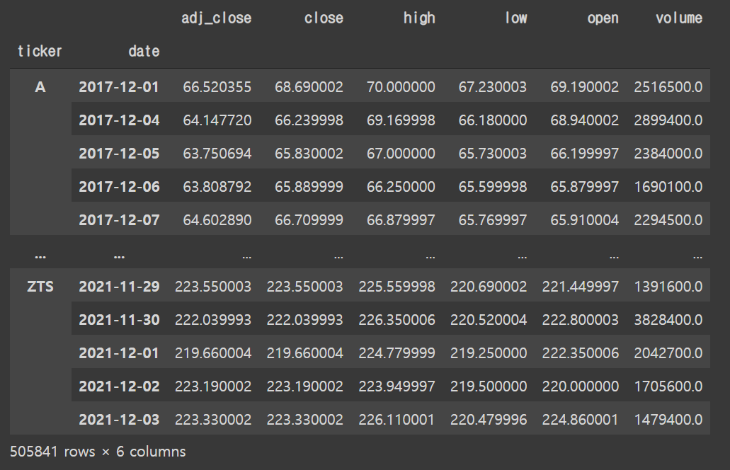 종목리스트는 공백으로 구분하여 하나의 문자열로 tickers인자에 넣어주면 된다. 또 S&P 500 종목 중 BF.B, BRK.B 티커는 그대로 넣으면 yfinance에서 처리를 못하기 때문에 '.'을 '-'로 바꾼 후 넣어줘야 한다. 종료일자를 12월 5일로 설정해주었는데 12월 3일이 금요일이라 12얼 4일을 종료일로 넣어줘도 된다(end에 원하는 종료일+1일을 넣어줘야 한다; 2021-12-03을 end에 넣으면 2021-12-02까지의 데이터를 가져옴).