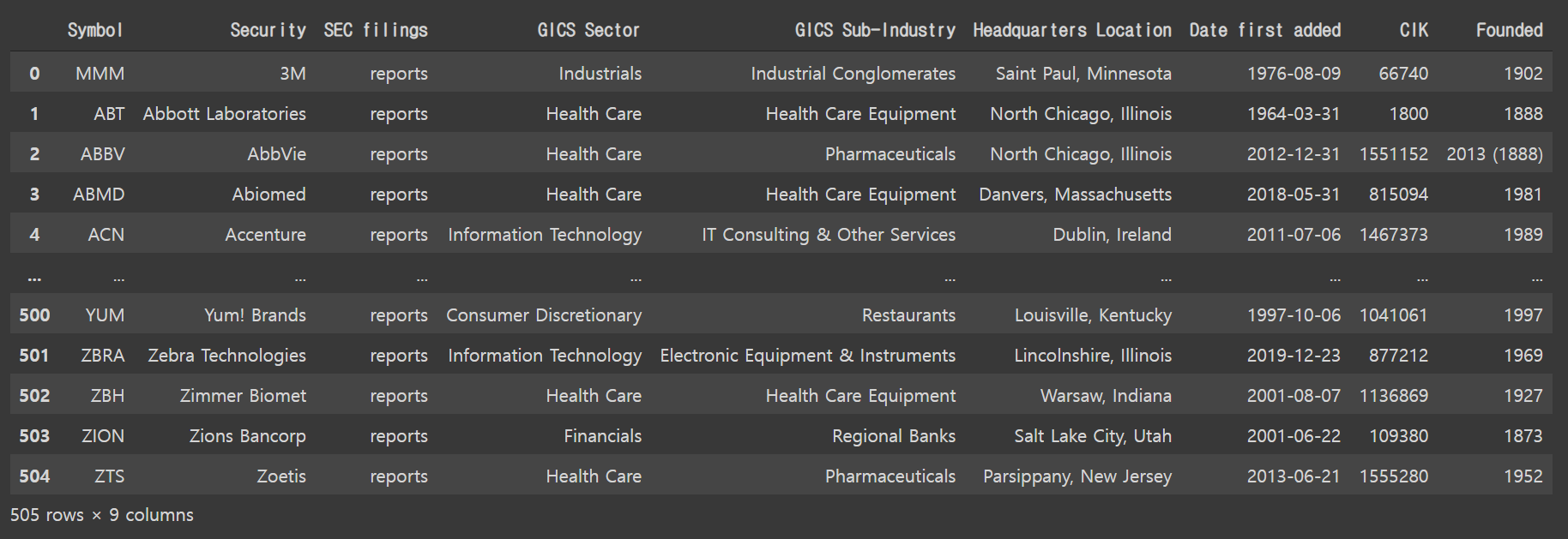 먼저 위키피디아에서 S&P500 종목 리스트를 가져온다.