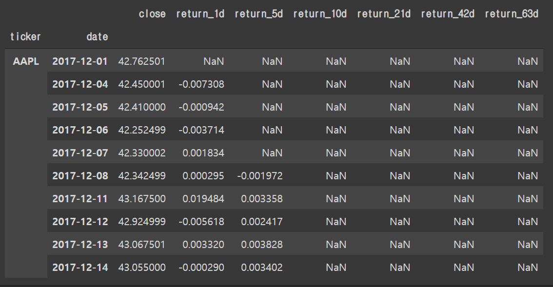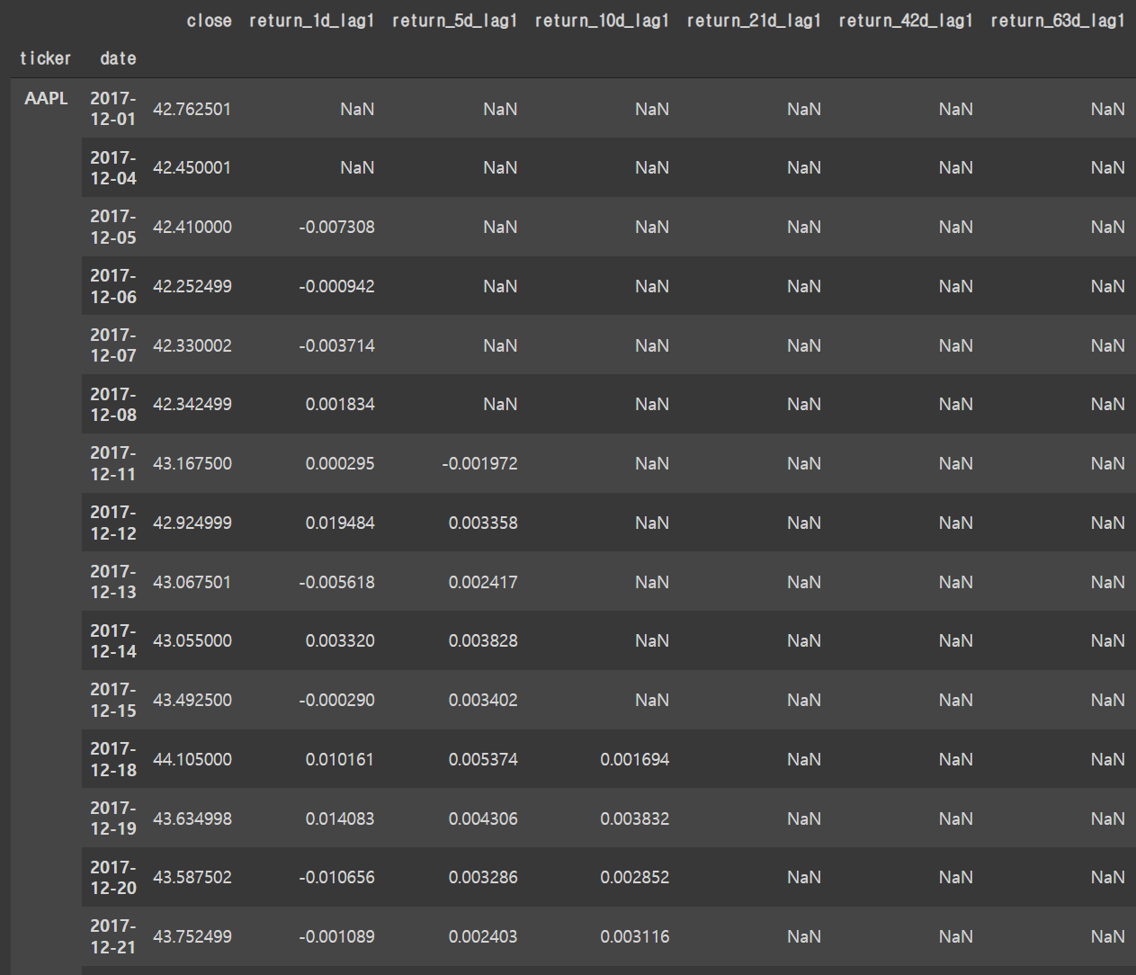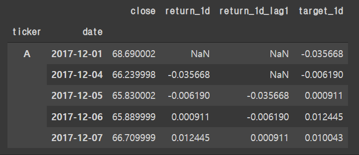 예를 들어, 애플(AAPL)의 2017년 12월 11일 시점에서 return_5d_lag1은 1영업일 전인 2017년 12월 8일에 계산된 최근 5일 평균 수익률이다.