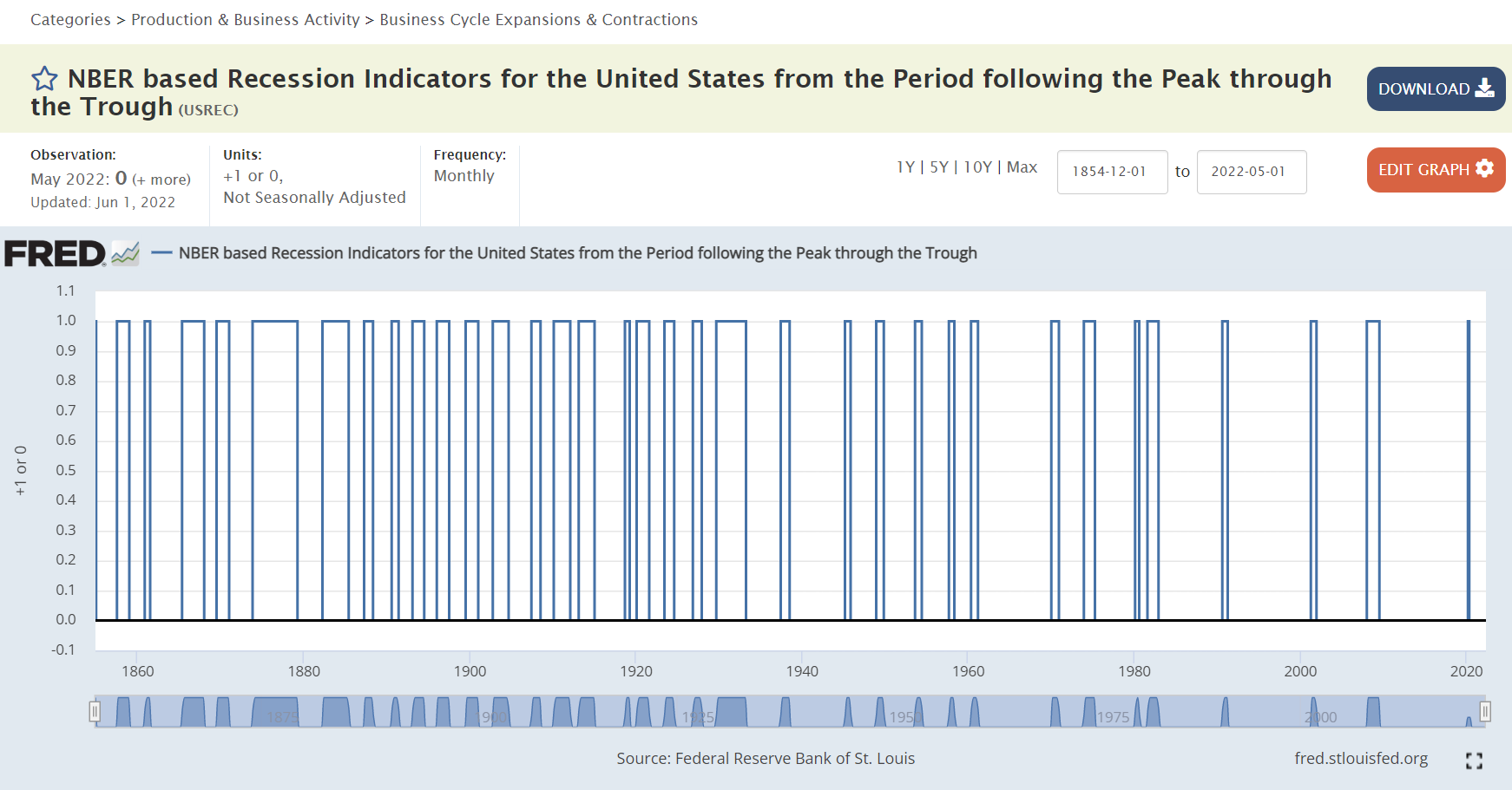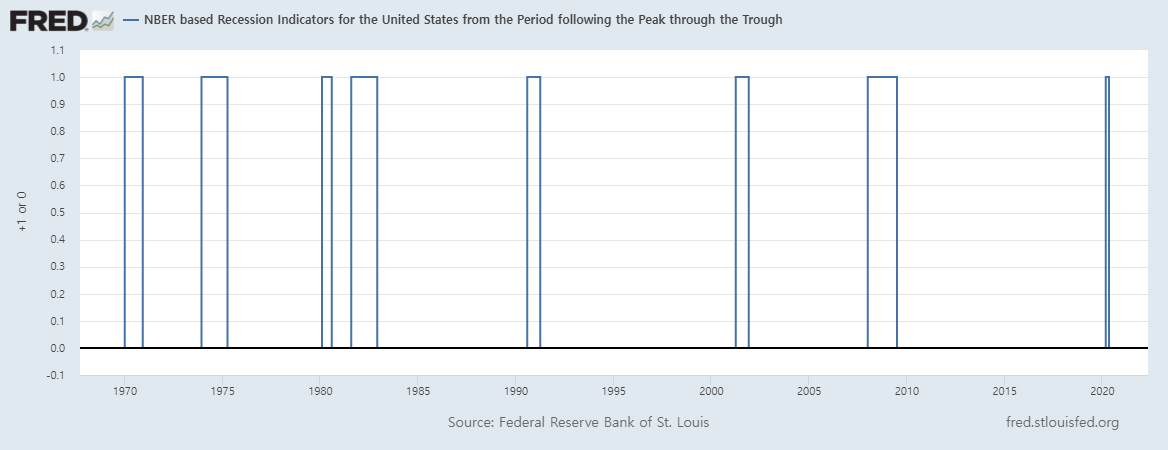 우리나라는 통계청, 미국은 NBER에서 사후적으로 특정 기간의 경기침체 여부를 '판정'하여 기록해 둔다고 한다. 요즘 뉴스에 자주 언급되는 내용들은 대부분 미국의 상황이기도 하고, 데이터를 구하기도 용이하기 때문에 이번 글에서는 미국의 경기침체에 대해 살펴보려고 한다.