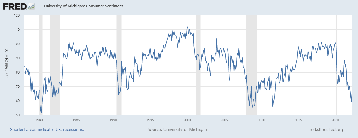 웹사이트에 게시된 내용을 보면 최근 조사결과가 1980년대의 경기침체 기간과 유사한 수치를 보고하는 영역이 보이는 것 같고, 소비자들이 최근 물가상승을 체감하고 있음을 알 수 있다. 아래의 그래프를 보아도 경기침체 시간에 소비자심리지수가 대체로 낮은 수치를 보임을 확인할 수 있다.