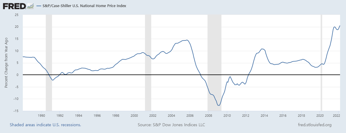 그래프를 보면 대체로 경기침체 구간에서는 신규주택 착공건수가 단기 저점을 기록하고, Case-Shiller 미국 주택가격지수도 전년 동기대비 감소하는 모습을 볼 수 있다.