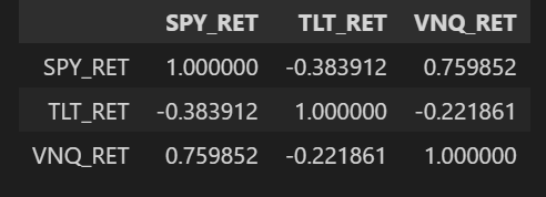 세 ETF의 일별 수익률의 상관계수를 구해보면 SPY와 VNQ의 일별 수익률 간 상관계수는 높게 나타나지만, SPY와 TLT, VNQ와 TLT의 일별 수익률은 음의 상관계수를 보여 반대방향으로 움직이는 자산이라는 것을 알 수 있다.
