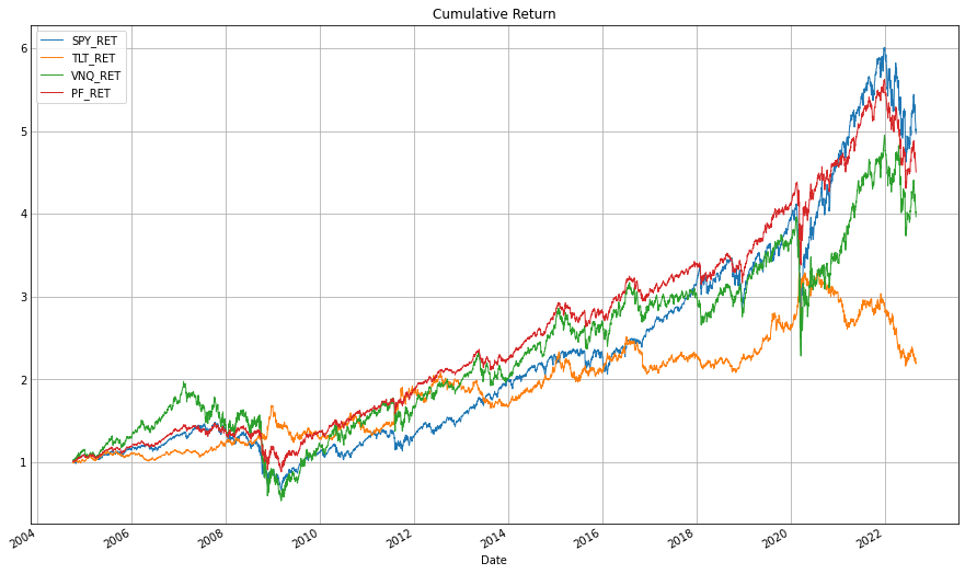 먼저 SPY, TLT, VNQ가 우상향하는 자산이 맞는지 보면, 정도의 차이는 있지만 모두 가치가 상승한 자산이라고 할 수 있다.