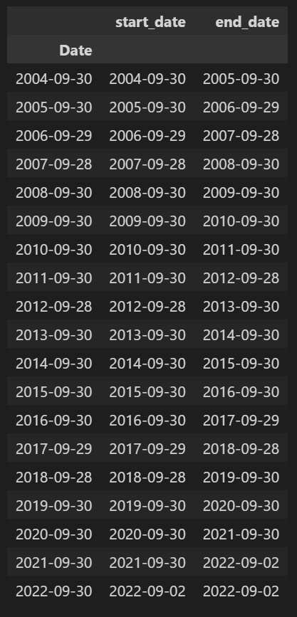 트레이딩 일자는 데이터가 존재하는 2004년 9월의 마지막 영업일인 2004년 9월 30일부터 시작하도록 하였고, 그 이후로는 1년 단위 리밸런싱을 위한 트레이딩 기간을 잡아주었다.