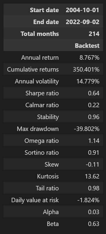 연복리수익률(Annual return)이 책에 제시된 값보다 1%p 정도 낮은 8.767%로 나왔고, MDD는 조금 더 좋지 않은 -39.802%로 나왔다. 샤프 비율(Sharp ratio)은 책에 제시된 값보다 더 낮은 0.64가 나왔고, 표준편차(Annual volatility)는 더 높은 14.779%가 나왔다. 전체적으로 보았을 때, 책에 제시된 결과에 비해 좀 더 좋지 않은 결과가 나왔다. 책에 제시된 결과는 1994년부터 2003년까지 기간 동안의 백테스팅 결과도 포함된 것인데, 이 기간동안 유대인 전략의 수익률이 그 이후 기간 대비 더 좋았다는 것을 추측해볼 수 있다.