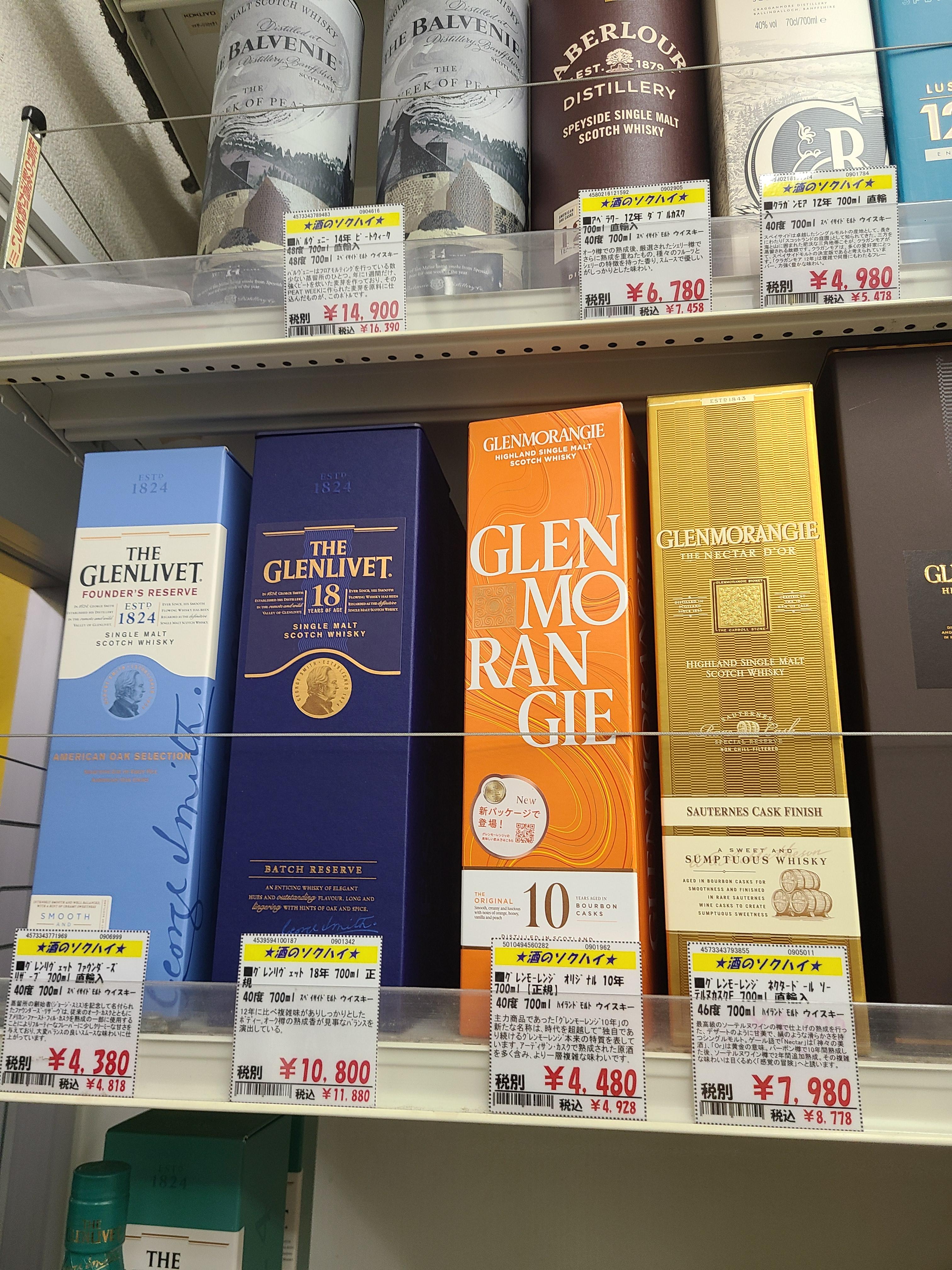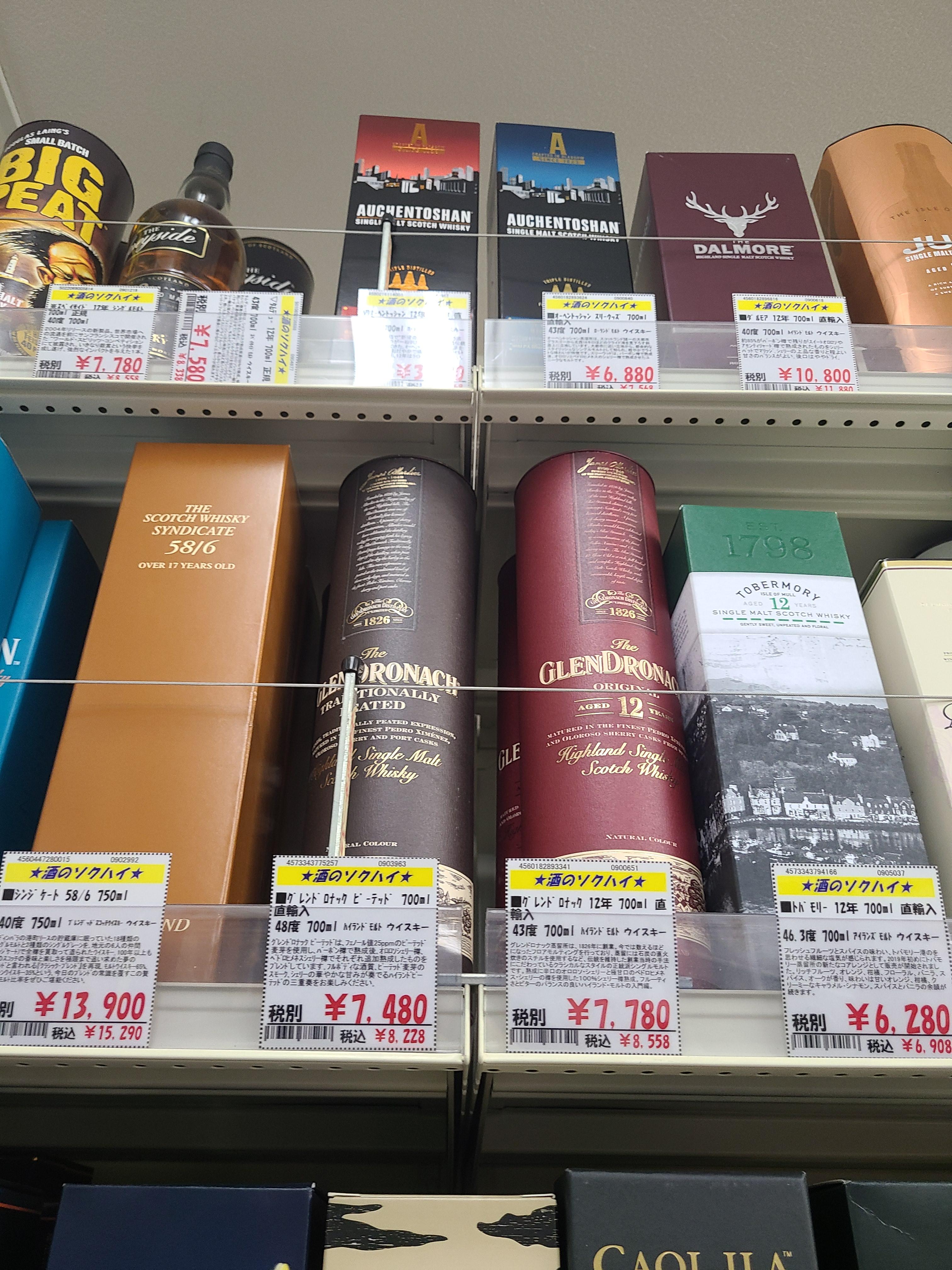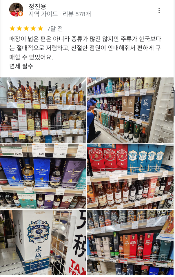 주류판매점이어서 확실히 빅카메라나 돈키호테보다 종류가 다양하다. 가격은 위스키 마다 빅카메라나 돈키호테가 저렴한 경우(글렌그란트 아보랄리스, 10년 가격을 보면 돈키호테가 좀 더 저렴)도 있을 수 있으니 비교해보고 사면 된다. 샴드뱅은 돈키호테와 마찬가지로 5000엔 이상 구매시 면세 적용된다고 하니 참고하면 좋을 것 같다.