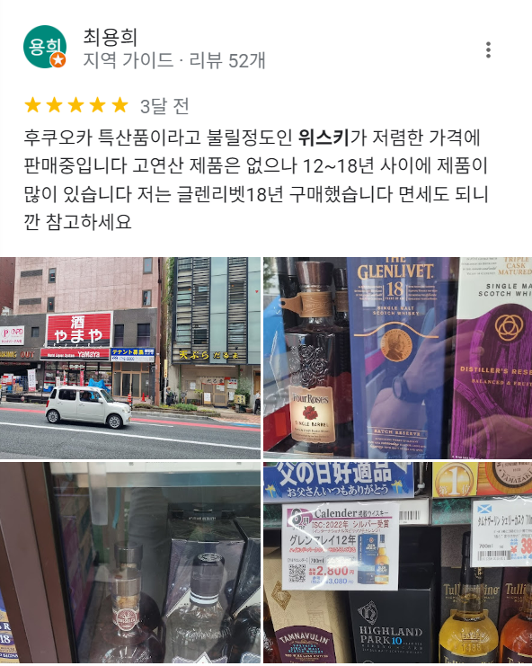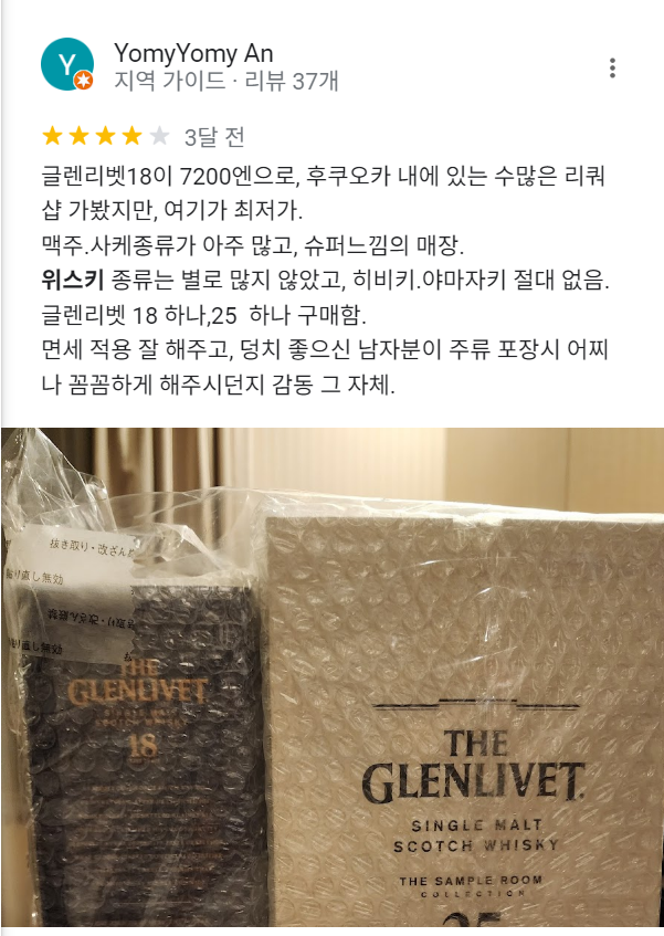 - 글렌리벳 18년이 7200엔으로 후쿠오카 리쿼샵 중 가장 저렴하다고 함