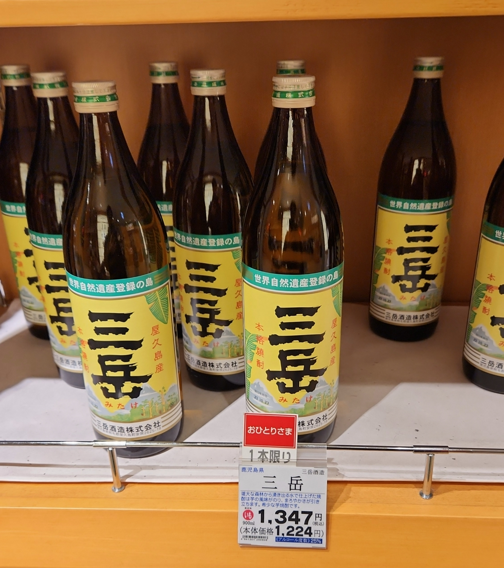 고구마 소주, 사케, 와인 등을 판매하는 리쿼샵으로 위스키도 있긴 하지만 몇 종류 없기 때문에 위스키 구매를 위해 가볼만한 곳은 아니다. 이곳에서 유명한 가고시마 고구마 소주 중 하나인 텐시노유와쿠(天使の誘惑, 천사의 유혹)을 구매했는데, 여행기간 동안 방문했던 가고시마 내 다른 리쿼샵에서는 텐시노유와쿠가 찾을 수 없었다(아래에 다시 언급하겠지만 후쿠오카 공항 면세점에는 있다). 텍스리펀은 안되고, 가격표에 있는 가격이 세금포함 가격이었던 것으로 기억한다. 미타케는 이 가게에 없었다.