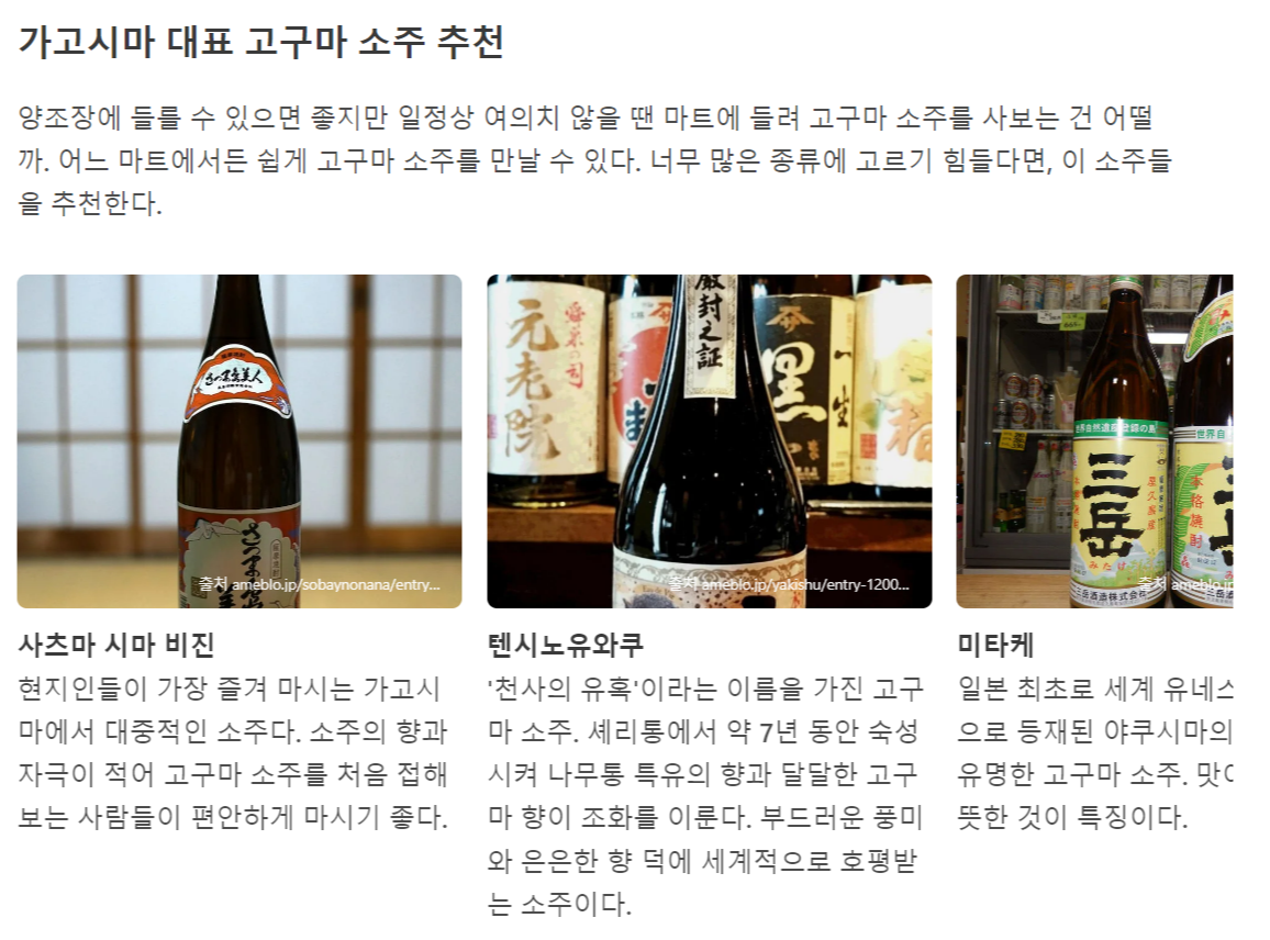 트리플의 가고시마 고구마 소주 소개글과 평소 즐겨보는 주토피아 채널에서 소개된 미타케와 텐시노유와쿠를 위주로 찾아보았다.