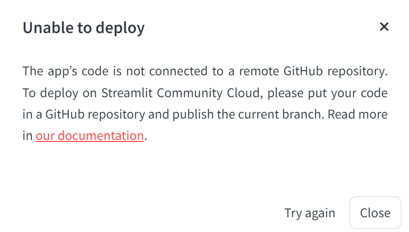 Git 리포지토리 내에서 로컬로 앱을 실행하는 경우 몇 번의 클릭만으로 앱을 Streamlit 커뮤니티 클라우드에 배포할 수 있습니다! 시작하기 전에 작업이 온라인 GitHub 리포지토리에 푸시되었는지 확인하세요. 최대한의 편의를 위해 이미 커뮤니티 클라우드 계정을 만들고 로그인했는지 확인하세요.