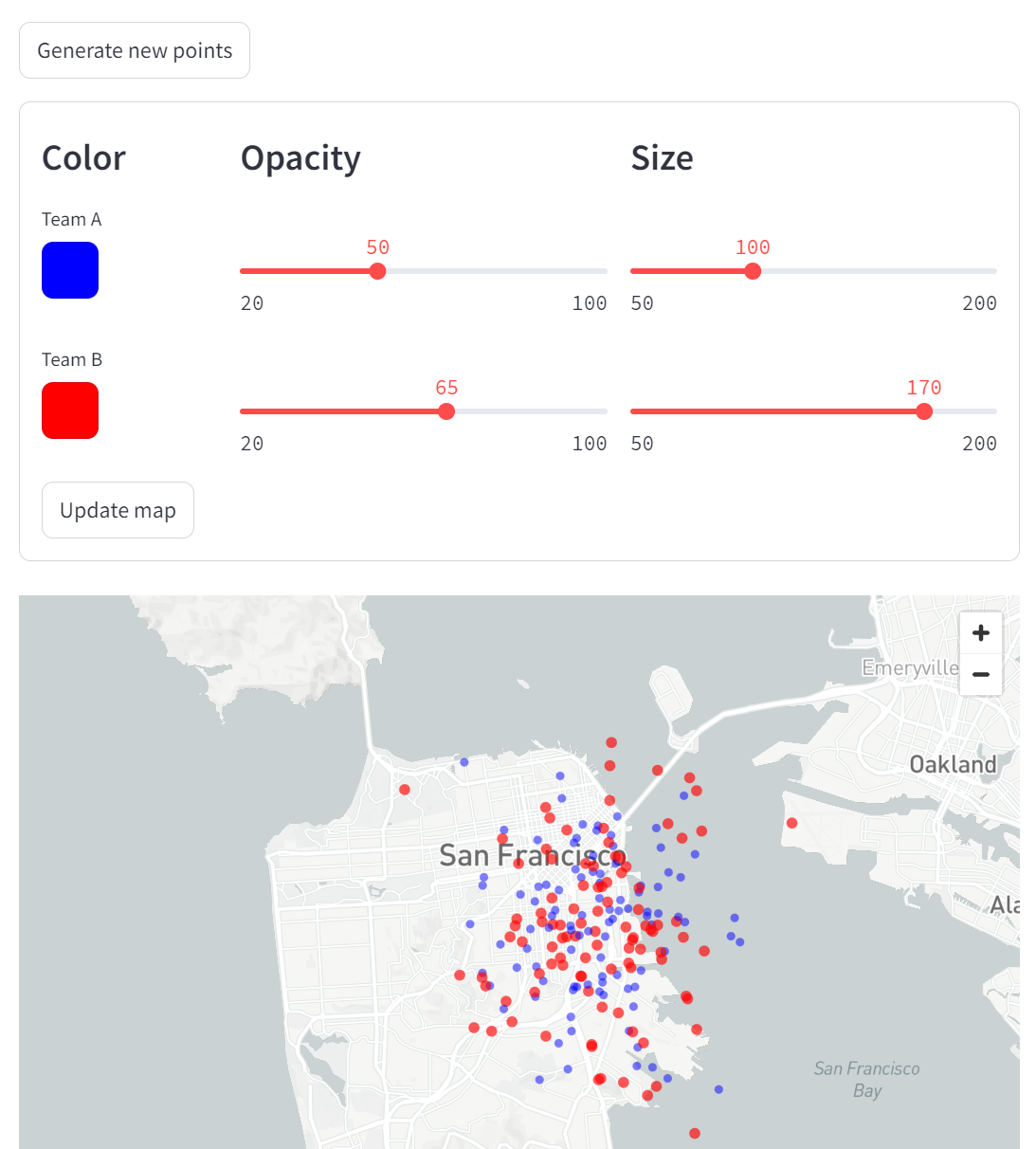 사용자가 언제든지 양식 외부에 있는 "Generate new points"을 클릭하면 스크립트가 다시 실행됩니다. 사용자가 양식 내에 제출하지 않은 변경 사항이 있는 경우 재실행 시 해당 변경 사항은 전송되지 않습니다. form에 대한 모든 변경 사항은 form 자체가 제출될 때만 Python 백엔드로 전송됩니다.