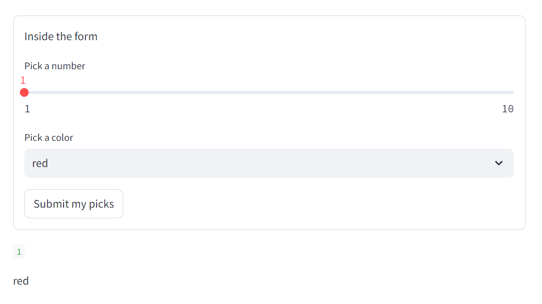 반면 위젯이 양식 내부에 있는 경우 사용자가 해당 위젯을 클릭하거나 탭아웃해도 스크립트가 다시 실행되지 않습니다. 양식 내부의 위젯의 경우 양식이 제출되면 스크립트가 다시 실행되고 양식 내의 모든 위젯이 업데이트된 값을 Python 백엔드로 전송합니다.