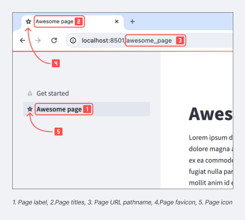 탐색 메뉴 내에서 Streamlit은 다음과 같이 페이지 레이블과 제목을 표시합니다: