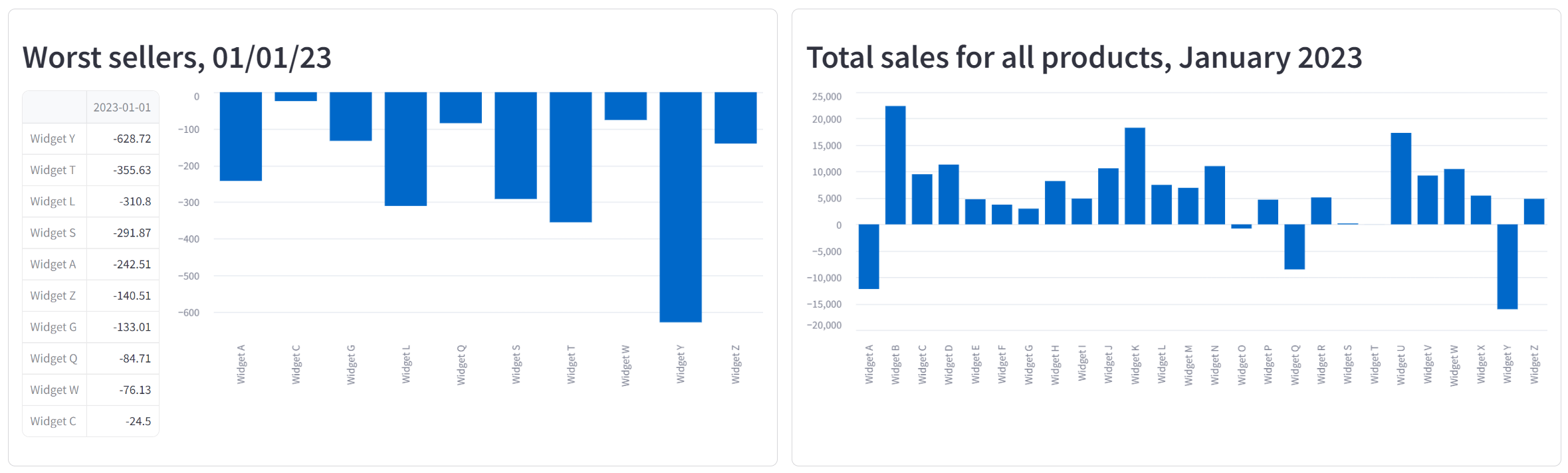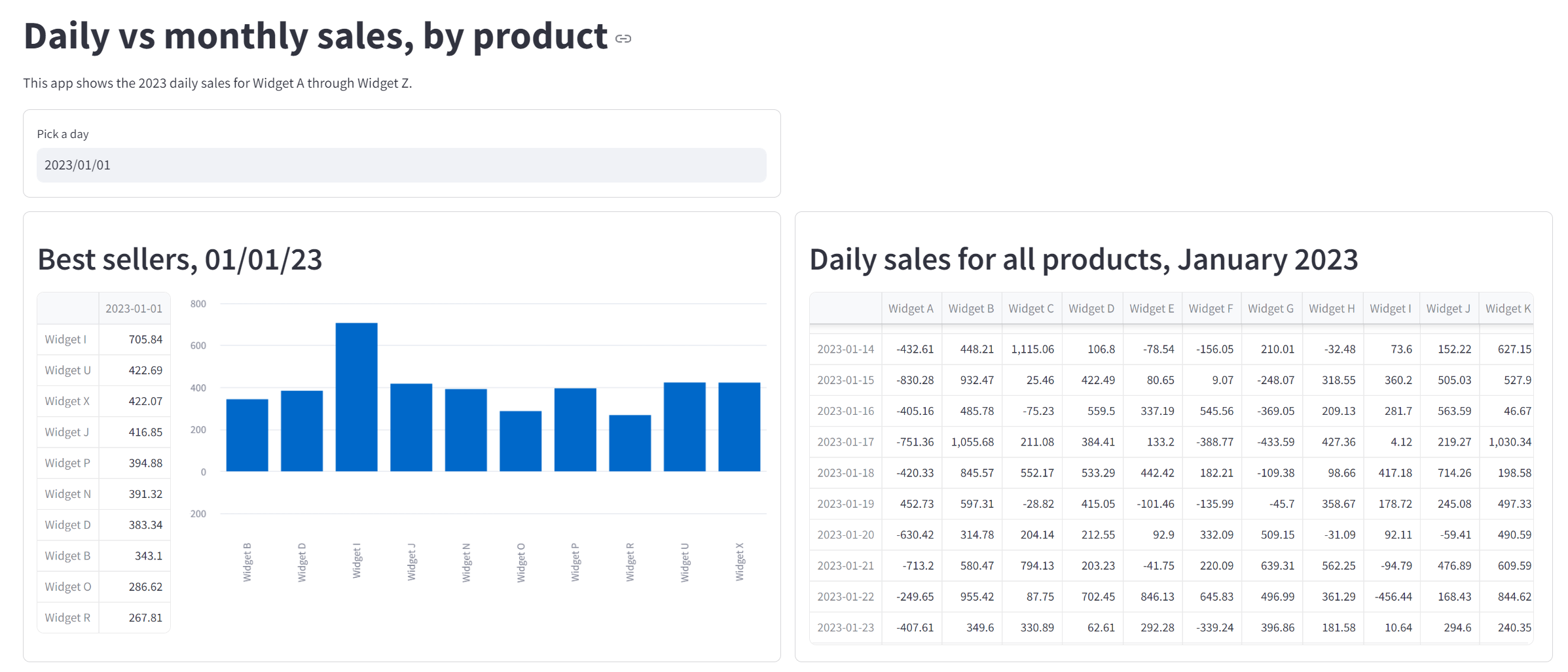 st.markdown("This app shows the 2023 daily sales for Widget A through Widget Z.")