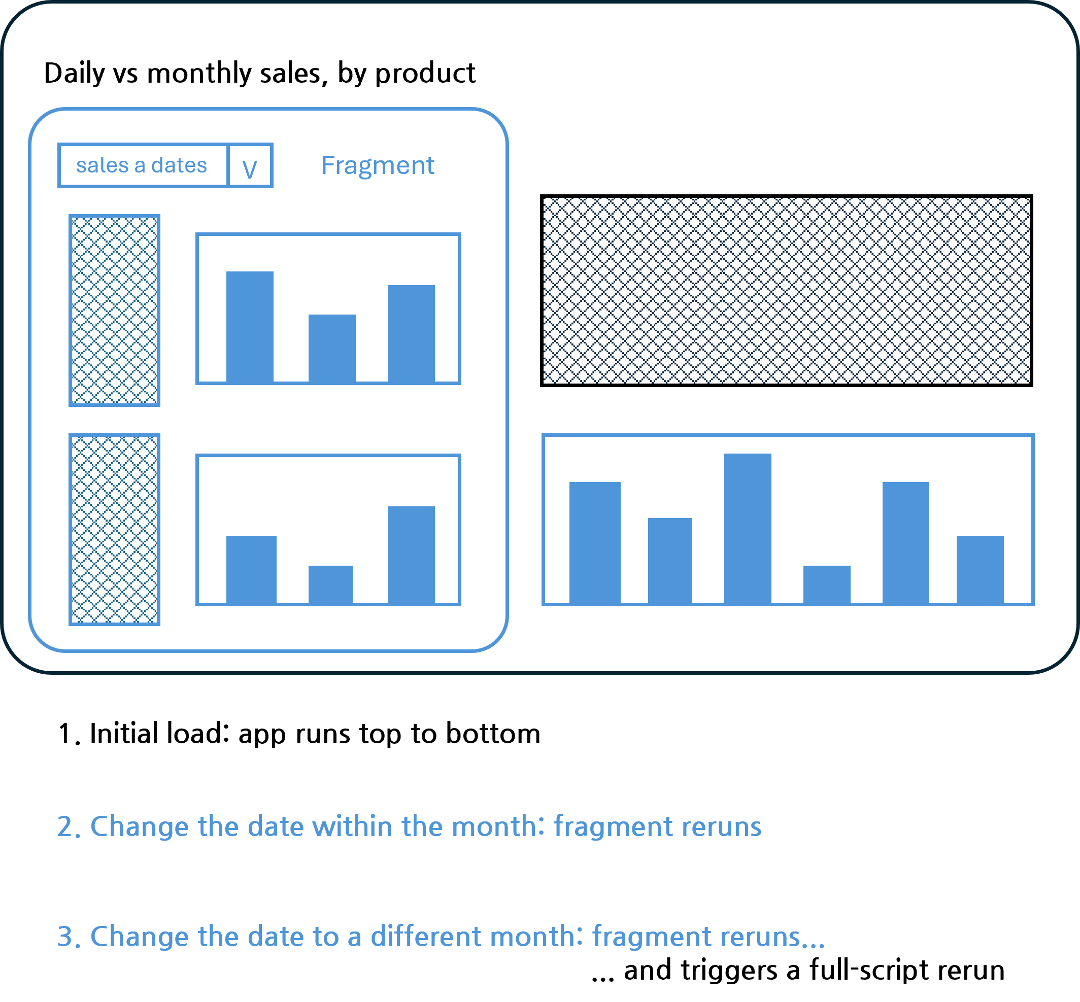이 예제에서는 판매 데이터를 표시하는 앱을 빌드합니다. 앱에는 날짜 선택에 따라 달라지는 두 가지 요소 세트가 있습니다. 한 요소 세트는 선택한 날짜에 대한 정보를 표시합니다. 다른 요소 세트는 관련 월에 대한 정보를 표시합니다. 사용자가 한 달 내에 요일을 변경하는 경우 Streamlit은 첫 번째 요소 세트만 업데이트하면 됩니다. 사용자가 다른 달의 날짜를 선택하면 스트림릿은 모든 요소를 업데이트해야 합니다.