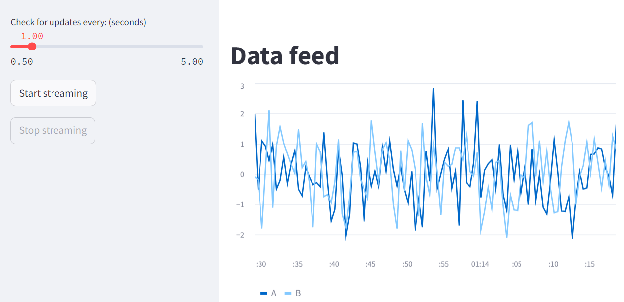 이 예제에서는 두 개의 데이터 시리즈를 라인 차트로 스트리밍하는 앱을 빌드합니다. 앱은 세션이 처음 로드될 때 최근 데이터를 수집하여 라인 차트를 정적으로 표시합니다. 사이드바에 있는 두 개의 버튼을 통해 사용자는 데이터 스트리밍을 시작하고 중지하여 차트를 실시간으로 업데이트할 수 있습니다. fragment를 사용하여 실시간 업데이트의 빈도와 범위를 관리할 수 있습니다.