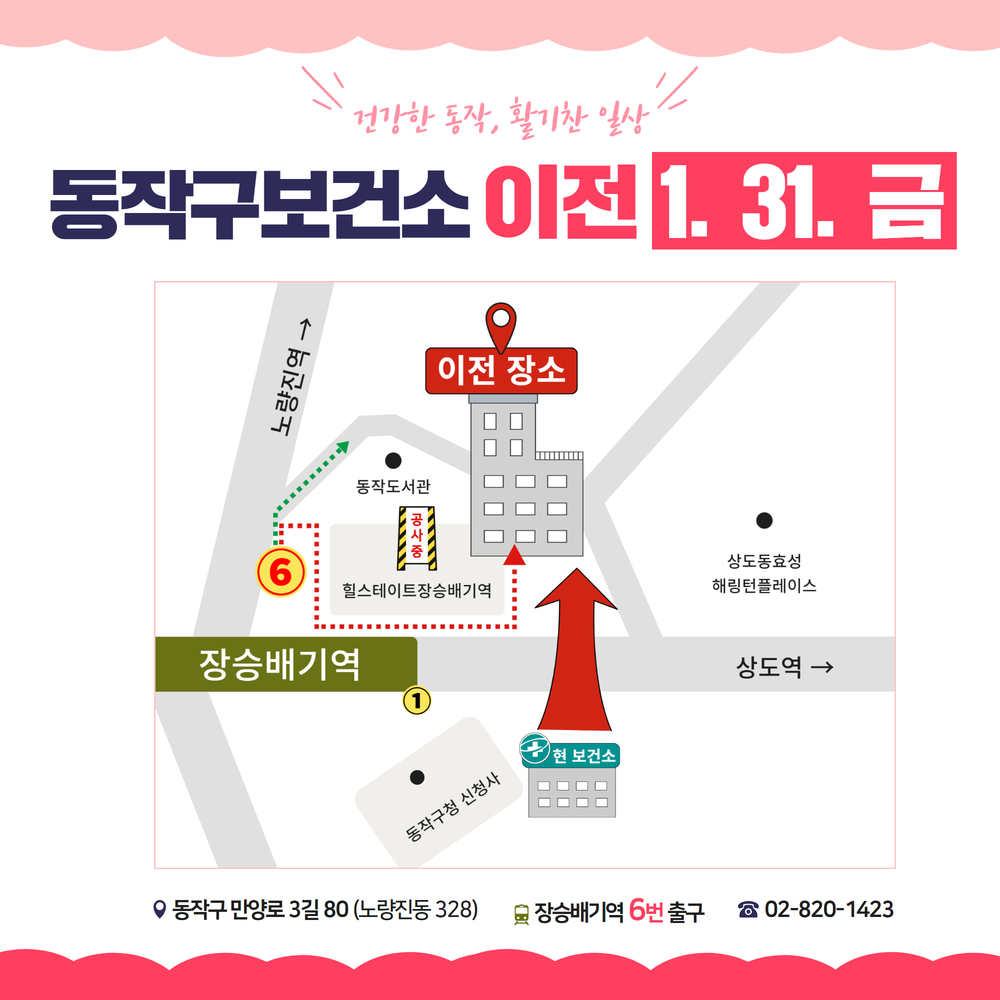 - 장승배기역 1번 출구쪽에 있던 동작구보건소가 장승배기역 6번 출구 쪽으로 이전함