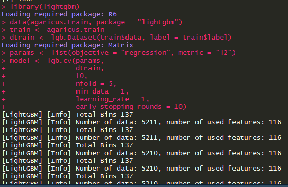 | library(lightgbm) data(agaricus.train, package = "lightgbm") train <- agaricus.train dtrain <- lgb.Dataset(train$data, label = train$label) params <- list(objective = "regression", metric = "l2") model <- lgb.cv(params, dtrain, 10, nfold = 5, min_data = 1, learning_rate = 1, early_stopping_rounds = 10) |